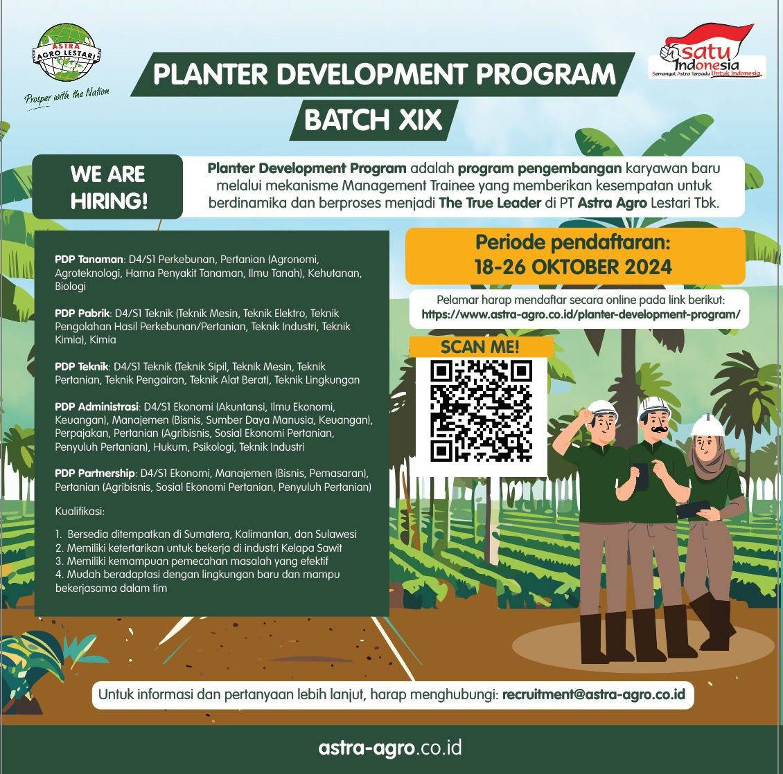 – Bersedia ditempatkan di lokasi kerja Astra Agro di wilayah Sumatera, Kalimantan, dan Sulawesi